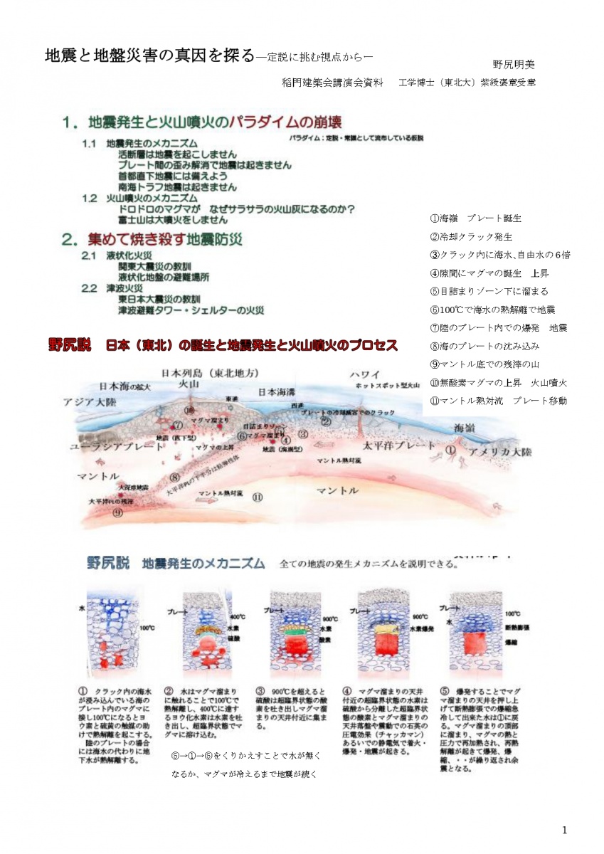 野尻氏は現場観察と長年の研究をもとに、「定説を鵜呑みにしない」「自分の目で確かめる」姿勢を貫き、「直観とイマジネーション」で地震発生、津波や液状化、火山噴火に関するパラダイム・シフトに挑みました。
