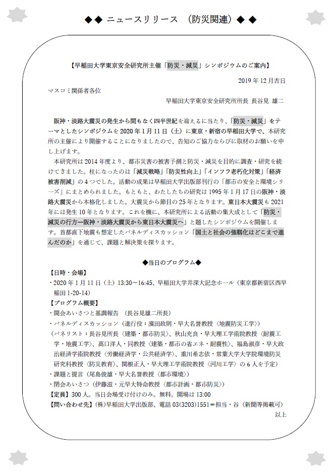 早稲田大学東京安全研究所主催 「防災・減災」 シンポジウムのご案内