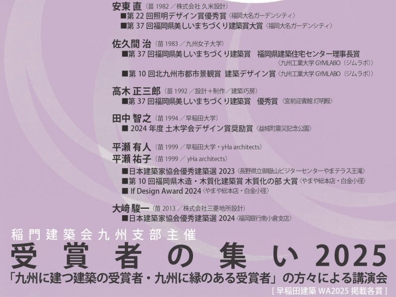 今年も12月6日に九州支部主催の「受賞者の集い」を開催予定です。 「九州に建つ建築の受賞者・九州に縁のある受賞者」の方々による講演会 安東 直(苗1982/株式会社 久米設計) ・第22回照明デザイン賞優秀賞 〈福岡大名ガーデンシティ…